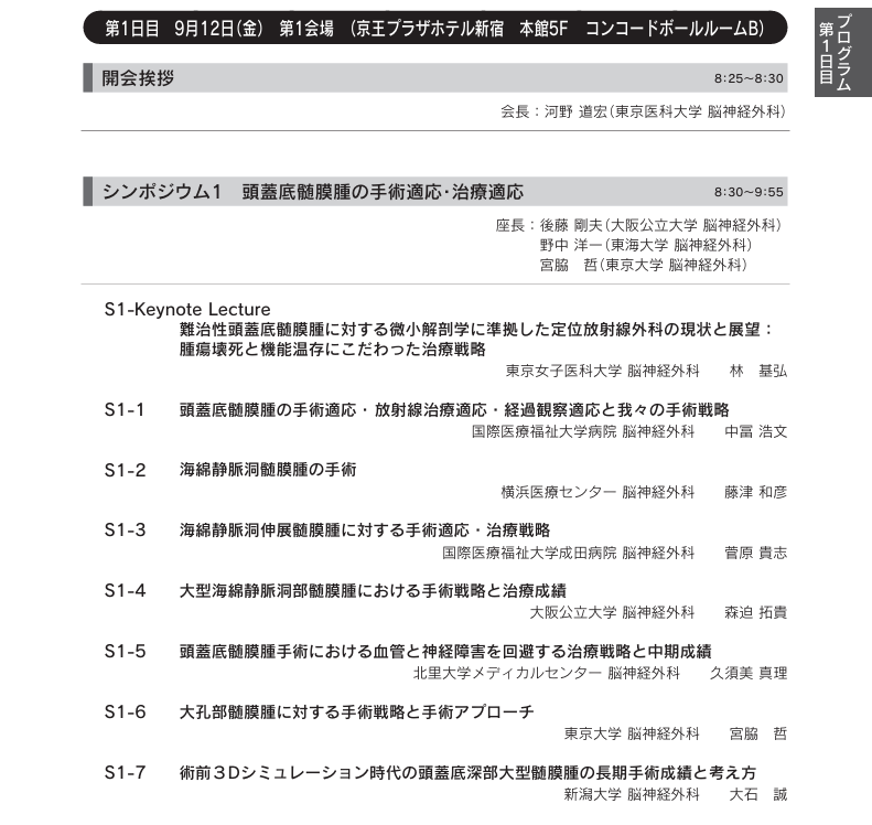 今回、学術大会長・河野道宏先生(東京医科大学脳神経外科教授)より第一日目・第一会場・第一番目の学術シンポジウムセッションの中の「第一席」においてKeynote Lecture(特別講演)を招聘講演という形でご依頼を頂きました。外科手術中心である本学会において、「切らない手術」である定位放射線手術の現状・展望・魅力について話してきたいと思います!