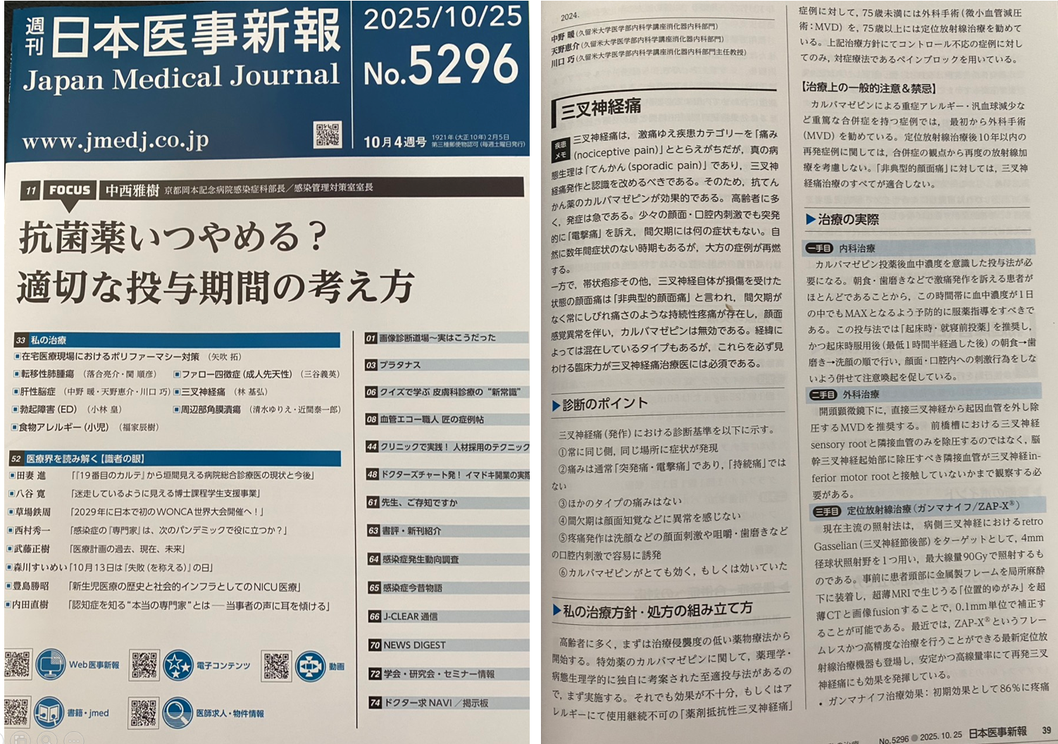日本医事新報 No.5296(2025/10/25号)「私の治療」に三叉神経痛治療に関する記事が掲載となりました