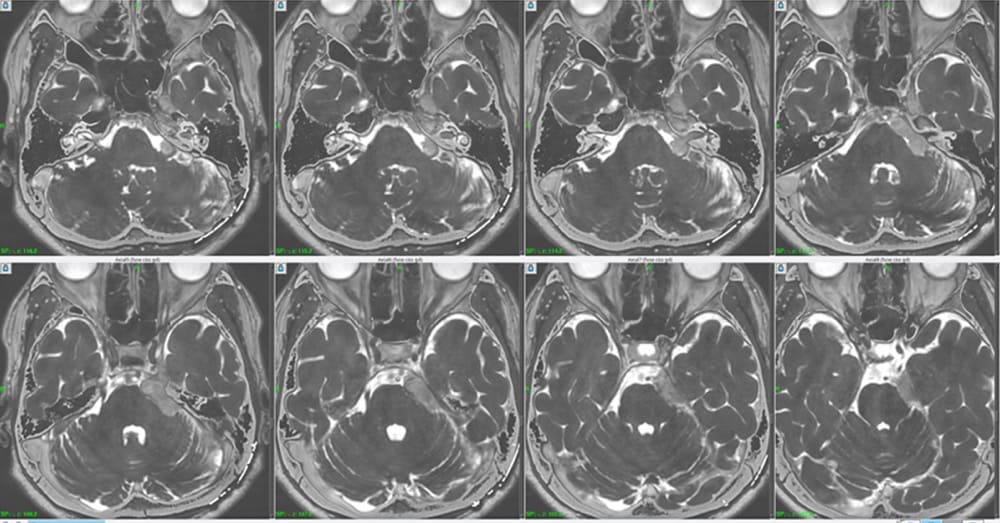 40歳代顔面しびれにて発症の頭蓋底髄膜腫症例。他大学病院にて外科的摘出を受け、ほぼ全摘出完遂。しかし、病理組織は悪性髄膜腫(Mib-1 >20%)とのこと、慎重にフォローしていたところ、術後3か月でほぼ元通りの大きさまで再発。顔面麻痺には至っていないものの、三叉神経障害に起因する顔面しびれは徐々に悪化してきていた。そこで、ガンマナイフへ急遽の紹介があった。その後、Gd造影CISS/FIESTAを施行(下図)